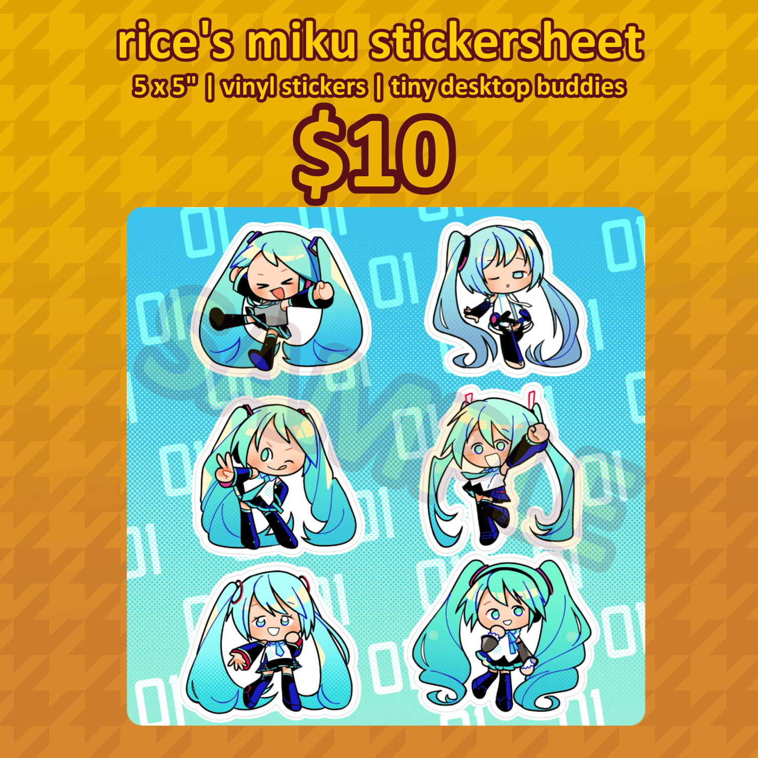 a 5 x 5" stickersheet featuring miku in different outfits. sorry i forgot to put these up before im doopid